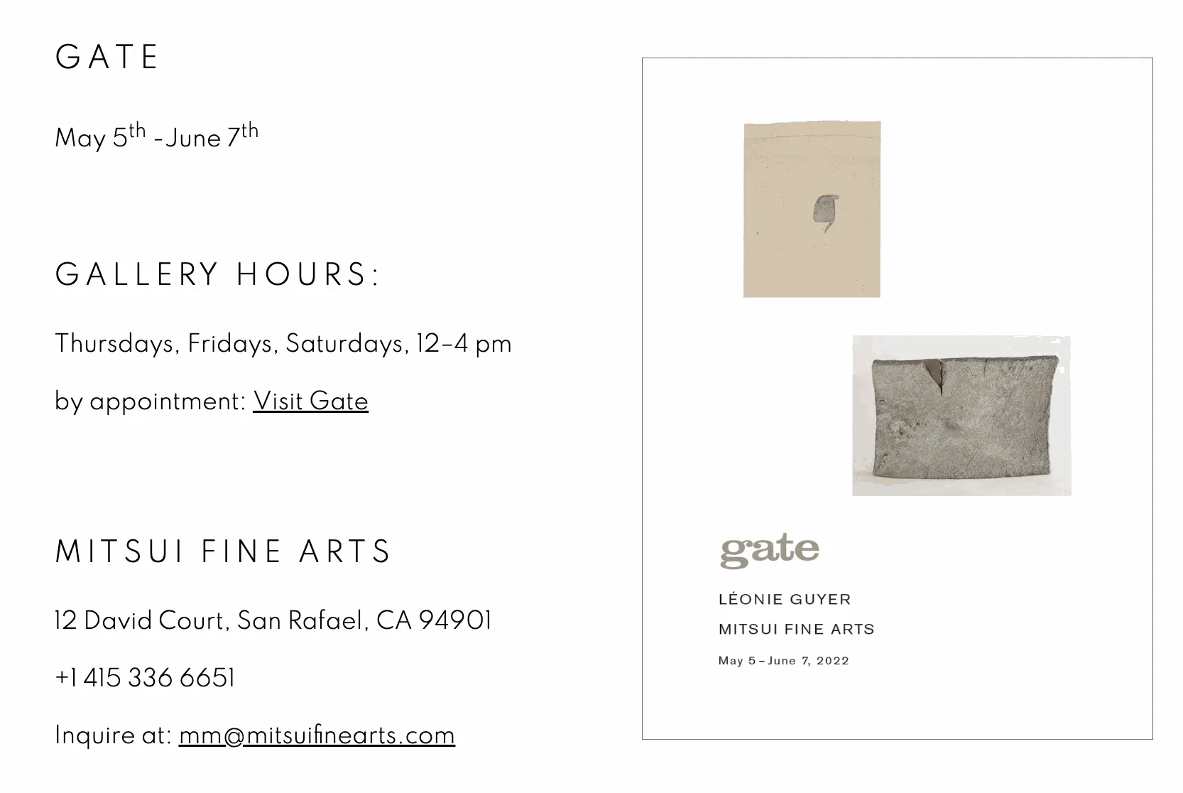 As Rita Bullwinkel wrote of Gate in her article* Outside of Time & Under Language", the particular cadence of each work is amplified by the centuries that separate their births. Like a congregation of ghosts, Misako Mitsui's Japanese works, and the works of Léonie Guyer bump up against one another." It is how the works of art, disparate across period and style, communicate with each other in the space of Mitsui's San Rafael art gallery that provides the energy and harmony for their collaborative exhibition.