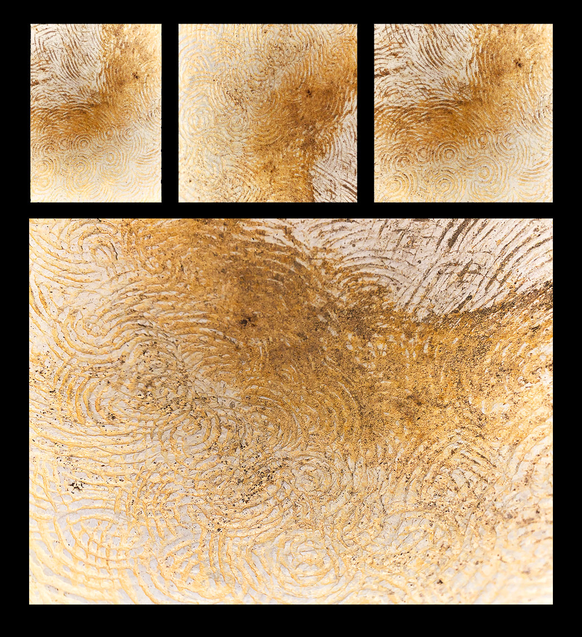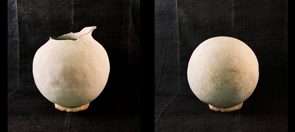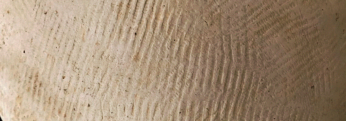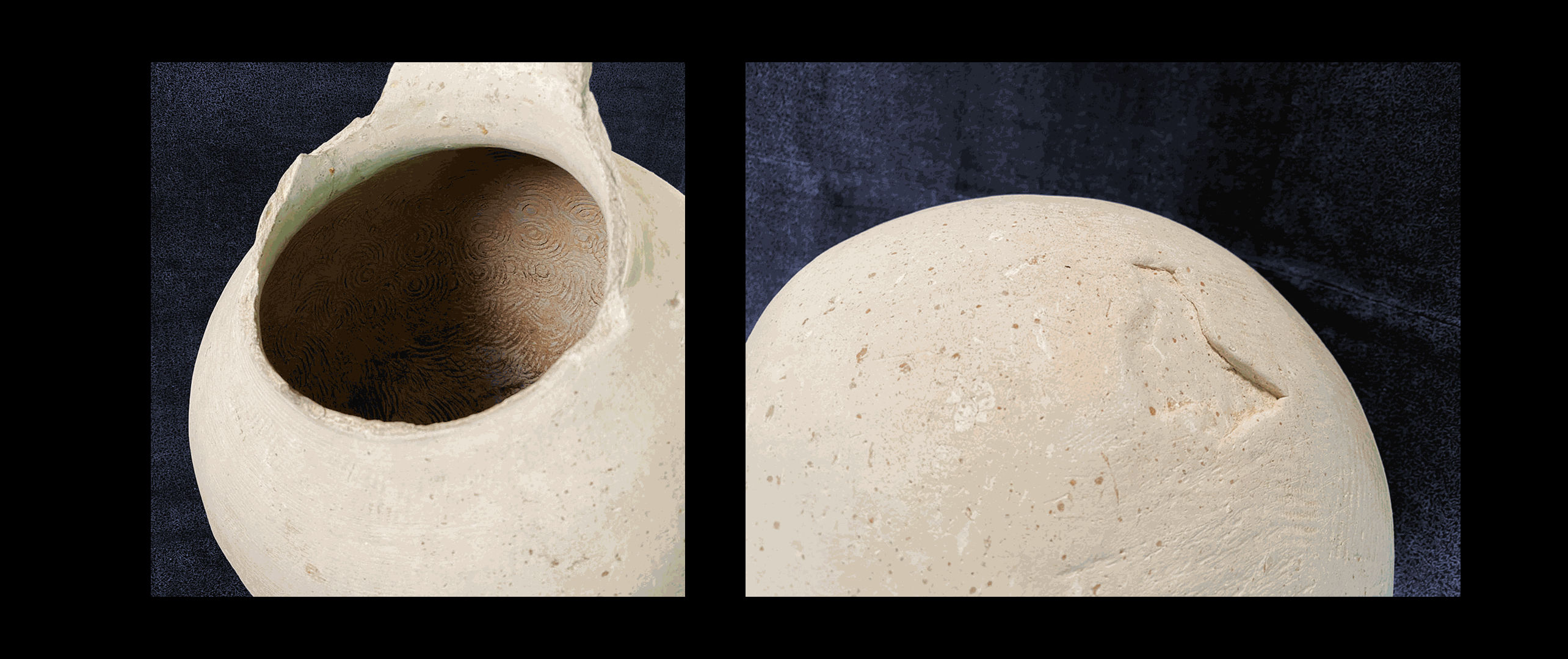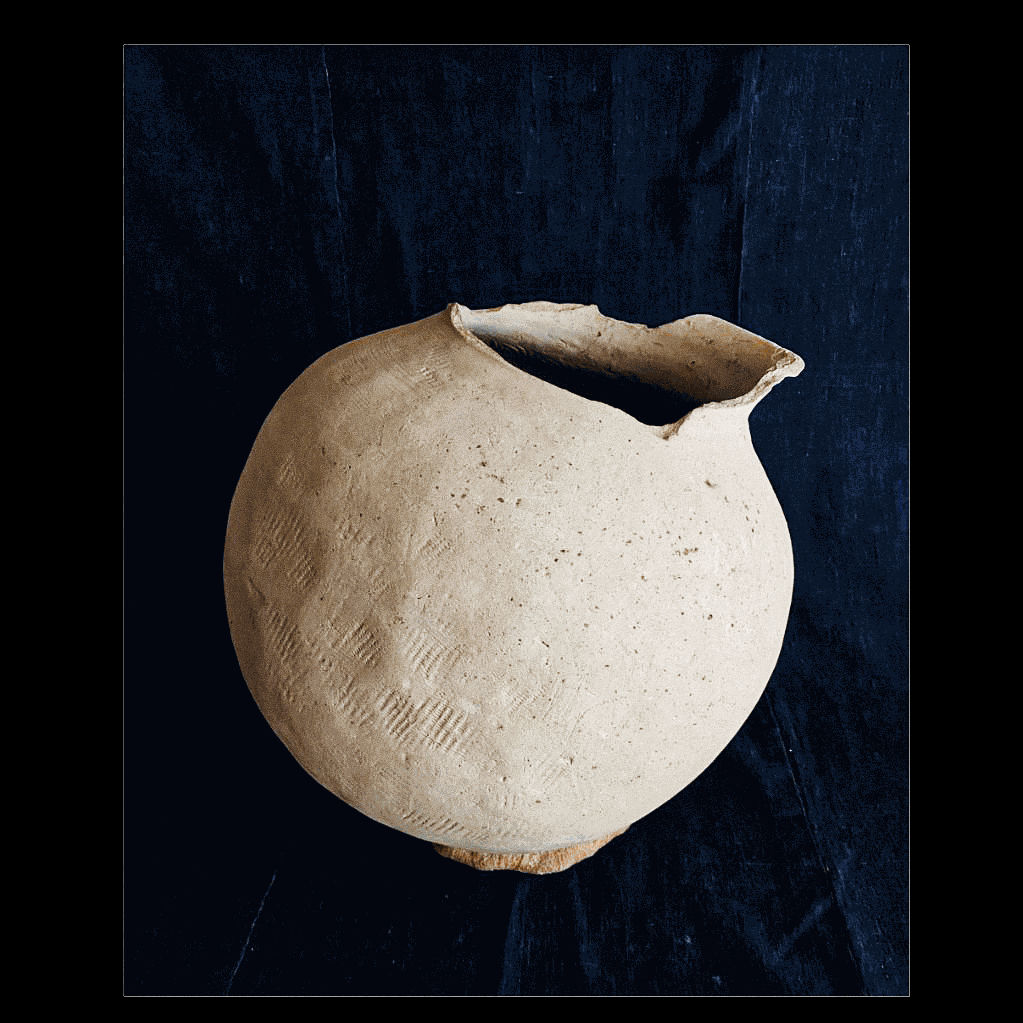 The shape, or the design of this pot, is breathtakingly stunning. The curvature and balance are as excellent as any significant pots in history and now. The collar has considerable damage, but the rest is perfect. A few examples survived from this era show big cracks or put broken pieces glued together. Meaning they are mostly broken pieces. Why, then, this pot survived in this good condition? Because it was deep under the river for over a millennium. During that time, the surface and inside of the pot were protected by and in contact with the finest grain of sand. As a result, its shape remained unbroken, and its color changed from muddy terracotta to exquisite white beige. Yet the original geometric pattern to decorate the surface made by scratching stayed here and there, as in the below images.